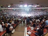| 8.12 | 両国国技館は、1万1500人の 観客で超満員札止め。 この日の「砂かぶり」の席を取る ために、ファンクラブの会員にな って、前から3列目の席をゲット。 長女の婿は、最後は声を嗄(か) らせていました。 真夏の祭典はこれで終了です。 |