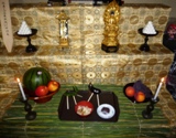 | 8.13 | 座敷にセットした、お盆の飾り付けの一部です。 手前にある茅の敷物は、おばあさんの実家からいただいたものを、11日に編みまし た。キュウリとなすのお馬さんは、琉くんと一緒に作ったものです。 今年はおばあさんの七回忌のため、お施餓鬼のときに塔婆を用意してもらいました。 本当は、軒先でお迎え万灯を焚かなければいけないのですが、雨が降っていたため 花火もできませんでした。 |