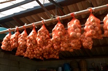 | 6.11a | 昨日畑でこいだ玉ねぎの、葉っぱの部分を切り取ったものを、ネットに入 れて吊しました。 松本に住んでいる義妹と、とのさまが手伝ってくれました。 実が小粒だったためか、袋の数は去年よりも少なかったです。 これだけあっても、いろいろな人にあげたりするので、1年間持たないかも しれません。 今年の秋は、もうひと畝増やそうと思っています。 |
