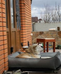 ひと月たち、やせこけ毛の艶もなくなり、この日キーウから同じ秋田犬を飼う夫婦が餌をもってやってきたが、