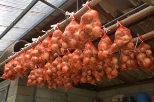 昨日一日乾(から)干しをした玉ネギは、朝露を避けるた