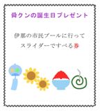 | 7.19b | 舜クンの10歳の誕生日です。 じいじからのプレゼントは、日高メロン5個だったけれど、まだ届きません。 そのほかには、7枚のプレゼント券を用意しました。 どれを選んでくれるかな? |
