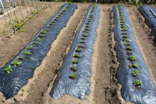 | 4.17 | ジャガイモが芽を出し、順調に育っている。 今年植えた種芋は80個。 以前は半分に割って、切り口に灰を塗ったものを植えてい たのですが、うまくいかない年があったので、それ以来切 らずにそのまま植えています。 少し余ったものをマルチを敷かない畝に植えたので、成長 具合を比べることができます。 もう少し経ったら、芽かきをして芽を2本にします。 |